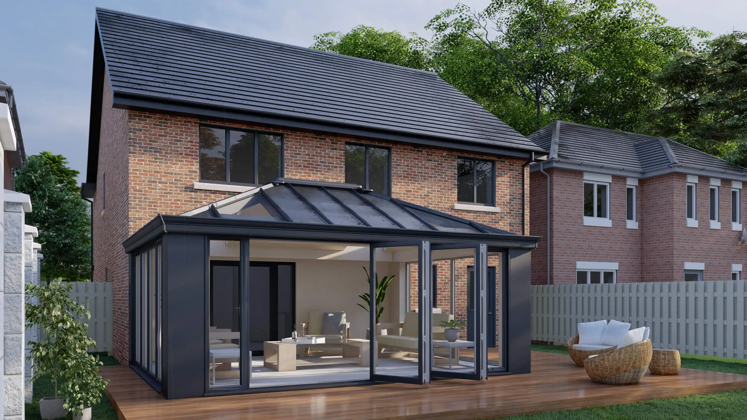 There are many reasons why we work with Ultraframe to bring their innovative Ultra380 roof to valued customers like we did in this project and can do for you. For a speedy and straightforward installation, this new roof is fabricated off-site. This means that when it came to carrying out the work on-site, it was a relatively easy task.Ultraframe’s modern roofs, expertly installed by our team, are available in modern styles and designs. This particular installation was chosen with ‘carbon grey’ lightweight slate tiles. These, combined with elegant and high-performance glass panels, allow plenty of light to fill the new living space while keeping it thermally efficient too.Finally, the rear wall of the property was removed, and the new house extension was completed. With a bigger and brighter living space in place, the customer was delighted with the enhanced look and feel of their home. Full of light, expertly installed and created bespoke, our house extensions are a true home improvement.